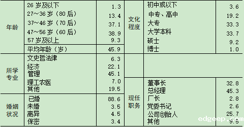 本次调查的女性企业家平均年龄为 45.9 岁,其中 57 岁及以上占 9.3%,47~56 岁占 38.9%,37~46 岁占 37.1%,27~36 岁占 13.4%, 27 岁及以下占 1.3%。文化程度为大专及以上的占 77.2%,其中具有 本科及以上学历的占 43.9%。所学专业为管理类的占 45.1%,为经济 类的占 22.1%。公司创始人或职务为企业董事长或总经理、厂长、党 委书记的占 90.5%;其他职务的占 9.5%(见表 2)。