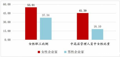 调查显示,男女性企业家所在企业的企业高管人数和职工总数较 为接近,但女性所领导的企业中,女性职工比例和女性中高层管理者 比重都高于男性领导的企业。具体而言,女性企业家领导的企业中, 女性职工比例高达 55.01%,超过一半,高于男性领导企业女性职工 的比例(37.34%)。女性企业家领导的企业中,女性中高层管理者占 比 45.39%,而男性领导的企业中这一比例仅为 18.1%。调查结果表明, 相对于男性,女性企业家更倾向于招聘女性职工,更愿意提拔女性高 管(见图 1、图 2)。