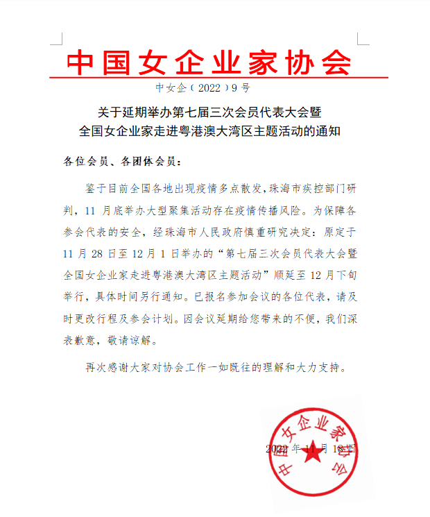 关于延期举办第七届三次会员代表大会暨 全国女企业家走进粤港澳大湾区主题活动的通知(中女企字﹝2022﹞第09号)