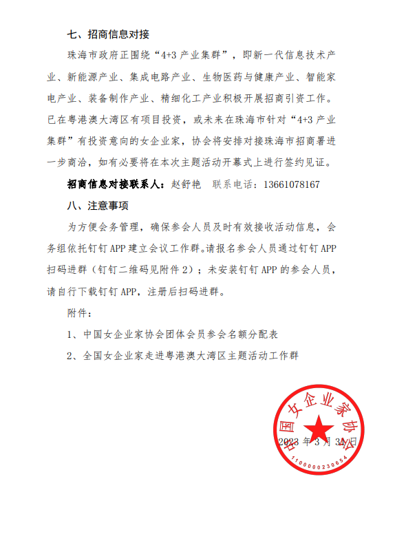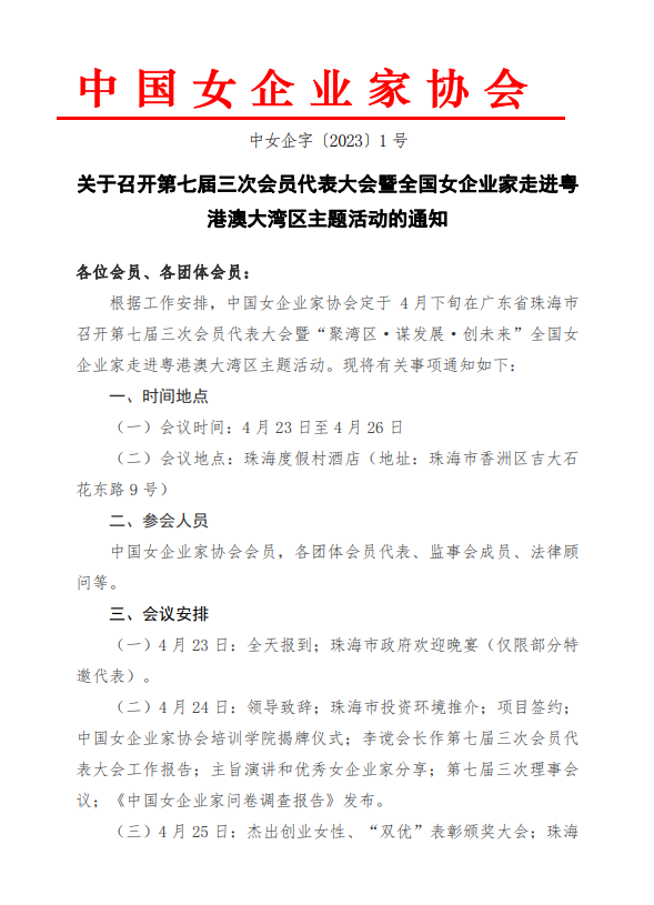 关于召开第七届三次会员代表大会暨全国女企业家走进粤港澳大湾区主题活动的通知(中女企字〔2023〕1 号)